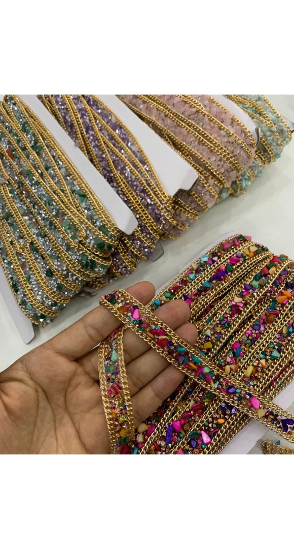Linda tira de cascalho e strass com corrente dourada nas