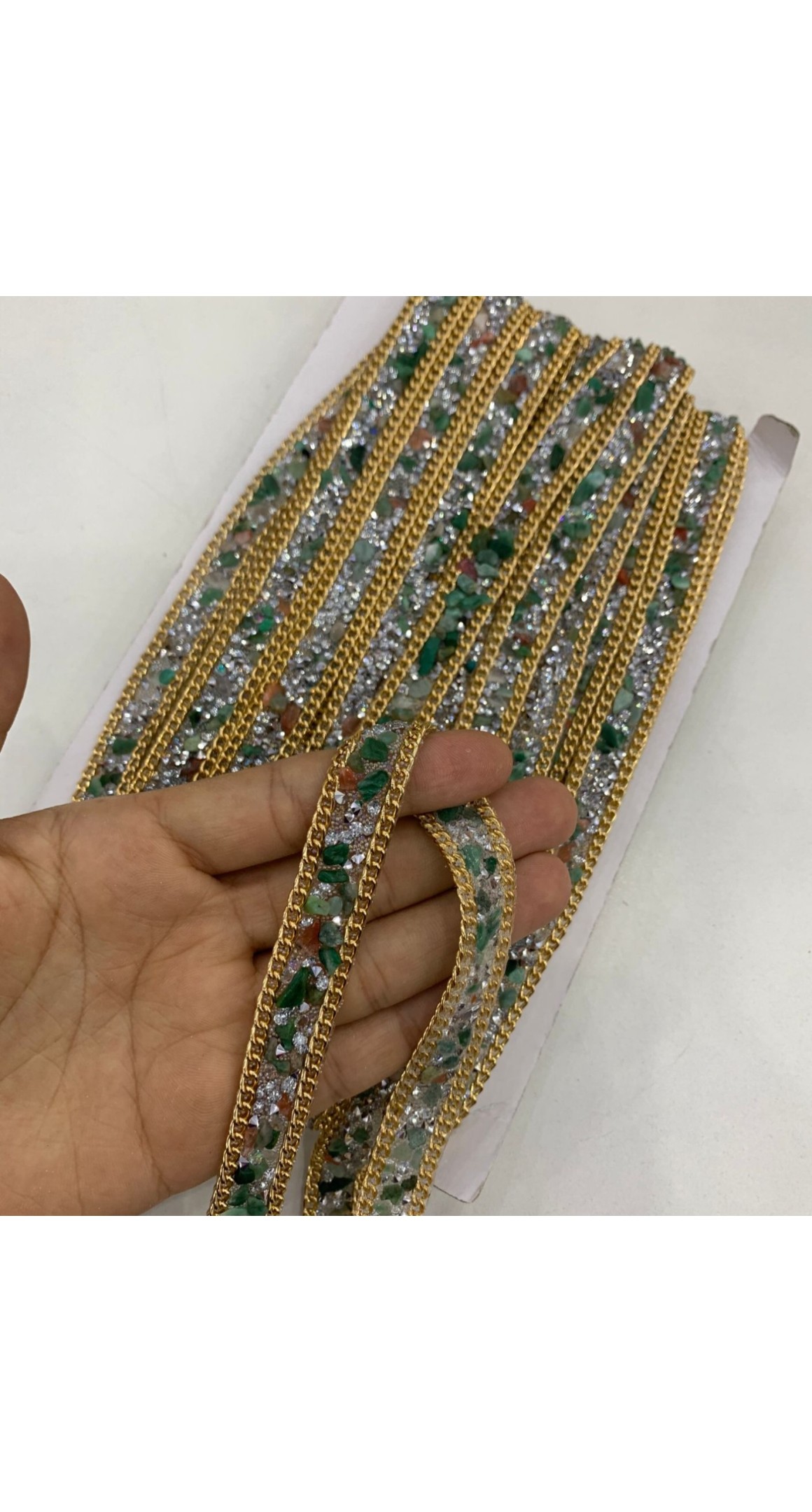 Linda tira de cascalho e strass com corrente dourada nas