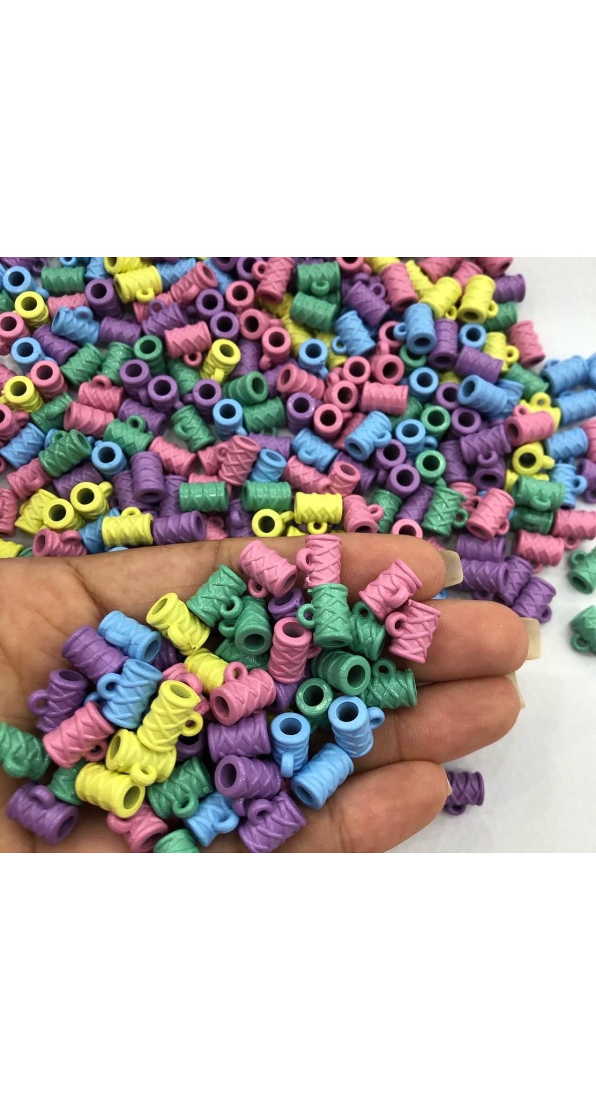 Pacote com 12 unidades de entremeio passante formato de caneca coloridas.